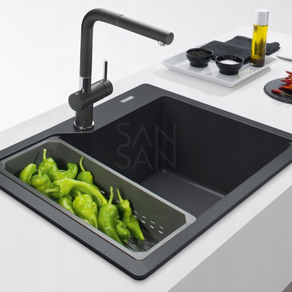Franke Urban UBG 610-56 onyx on Fragranit-graniitista valmistettu uppoasennettava keittiön pesuallas, joka voidaan upottaa tai yksinkertaisesti upottaa. Franke UBG 610-56 -pesuallas ei jää huomaamatta missään keittiössä. Mukana on ruostumattomasta teräksestä valmistettu 3 1/2" painikkeella avattava pesualtaan siiviläventtiili. Alakaapin minimileveys on 60 cm. Leveän viemäröinnin ansiosta tiskialtaan alle on mahdollista asentaa myös jätepuristin.