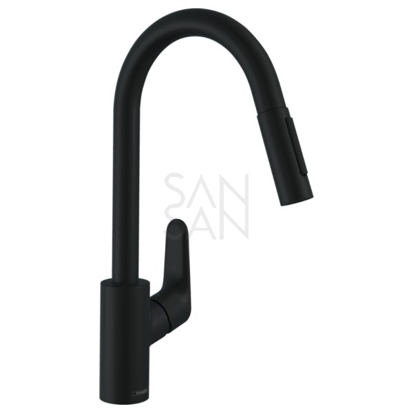 Keittiöhana Hansgrohe Focus M41 240 mattamusta, jossa on ulosvedettävä käsisuihku