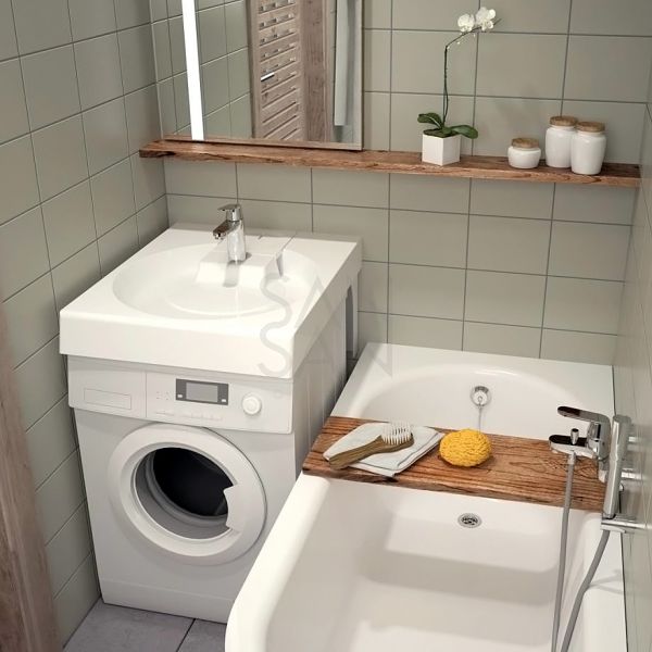 Pesukoneen päälle asennettu pesuallas on nerokas ratkaisu pieniin kylpyhuoneisiin. Tämän pesualtaan ansiosta on mahdollista käyttää 60 cm leveää pesuallasta ja sijoittaa silti täysikokoinen pesukone.