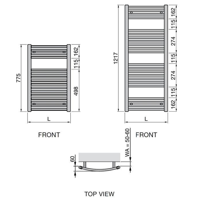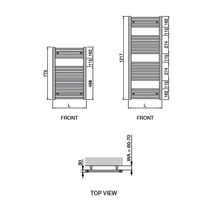 Alla olevasta valikoimasta voit valita sopivat pyyhekuivausrummun mitat. Lämmitysjärjestelmään liittämiseen tarvittavat lisävarusteet eivät sisälly toimitukseen. Putkiliitäntöjen välimitat mittojen mukaan (500 ja 600 mm).
